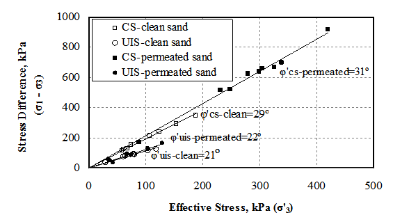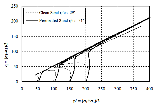 Static liquefaction occurs in loose sand specimens when subjected to monotonic loading. As the shearing progress, the positive pore pressures approach the initial effective stresses and the shear resistance of the sand approaches zero. While only very loose sands reach complete static liquefaction, loose and medium density sands can reach an undrained instability state and a quasi-steady state before starting to dilate and regain strength. The ability to minimize the strength loss during these intermediate "weakness zone" can provide of vital importance for stability and safety of substructures. The first figure below shows the stress path fro clean sand and permeated specimens at different initial effective stresses. The grouted specimen show a more dilative behavior and less tendency towards static liquefaction. The second figure show the calculated friction angles at the undrained instability state and at critical state. Both sands show similar friction angles indicating that the grouting improved static liquefaction resistance without compromising shear strength. |