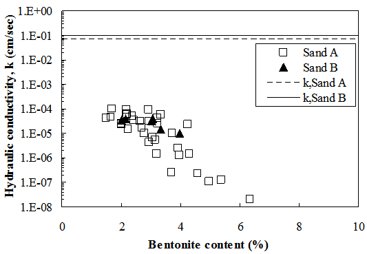 B) Improving hydraulic conductivity performance Bentonite grouting would be effective where seepage is the major issue or for secondary containment barrier systems by improving hydraulic performance of granular soils. Although the hydraulic conductivity of the bentonite grouted sands has not been studied extensively, previous research with Sand-Bentonite Mixtures (SBMs) showed a significant reduction in hydraulic conductivity of sands (approximately 3 to 7 orders of magnitude) with 3 to 30% bentonite contents in sands. However, the application of bentonite suspensions in permeation grouting has been limited due to low mobility of bentonite suspensions resulting in low penetration depth and little practical applications (especially for concentrated suspensions that needs to be utilized to achieve the required high bentonite contents similar to SBMs for a significant reduction in hydraulic conductivity). Current advances in Pore Fluid Engineering has allowed us to manipulate the rheology of bentonite suspension to allow for delivering high bentonite contents into the sand pores. The figure below shows an example in the reduction in hydraulic conductivity of permeated sands as a function of the delivered bentonite content. |