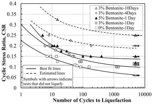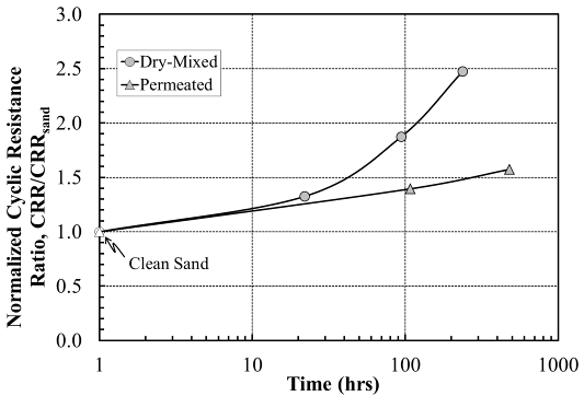 Many soil improvement methods have been introduced to counteract liquefaction threat, the easiest of which is soil compaction by different methods. However, soil compaction (especially dynamic compaction) can often be harmful to existing structures on or nearby liquefiable soil deposits. Thus, permeation grouting or "passive site remediation" has been proposed for stabilizing liquefiable soil deposits at sensitive or developed sites. The current research approach is to use permeation grouting to deliver bentonite to the sand pore to increase its liquefaction resistance. The first figure below shows some results of cyclic triaxial testing on sand-bentonite specimens prepared through dry mixing for "wished in place" bentonite. The results show a significant increase in the number of cycles to liquefaction with increasing bentonite content and /or aging time. The second figure shows the increase in Cyclic Resistance Ratio for dry-mixed specimens versus permeated specimens. The tests on the permeated specimens are still in the preliminary stages. |