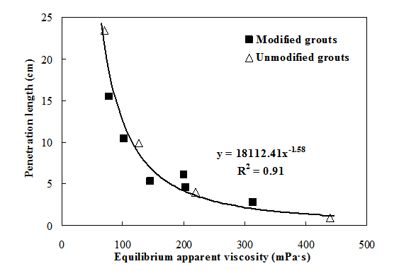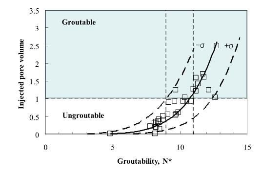 For this research, groutability of granular soils using sodium pyrophosphate (SPP) modified bentonite suspensions was studied to investigate its applicability in permeation grouting. While the relative grain size of the soil and the grout has been widely used to evaluate the groutability of granular soils with particulate grouts, such criteria do not account for the effect of the suspension concentration as well as chemical modifications of grouts. The modification of grouts may improve the depth of its penetration, and thus changing the groutability of the granular soils. For such cases, the rheological properties of grouts become crucial to evaluate groutability of soils. The modified bentonite suspensions were injected into the saturated sand columns prepared at various experimental conditions (effective particle size, relative density, and fines content) under two different constant pressures (35 and 140 kPa). The results showed that the injected pore volumes and injection length increased with an increase of the apparent viscosity at equilibrium. |