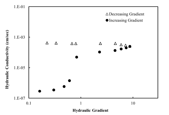 Once the bentonite is delivered into the porous medium, its persistence within the pore space determines the long term performance of the grouting. The mechanisms governing the stability of the grouts in the pores is a major aspect of the current research. The insitu stability of bentonite grout in permeated sands under different groundwater conditions is investigated by studying the hydraulic conductivity of permeated sand permeated under increasing hydraulic gradients; when washing out of bentonite occurs, the hydraulic conductivity increases. The specimens are then subjected to a decreasing gradient test to verify that the changes in measured hydraulic conductivity results are due to washing out (as compared to non-Darcian flow effects due to the high gradients). |