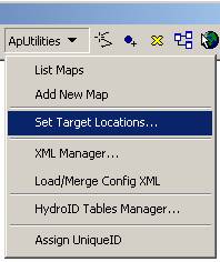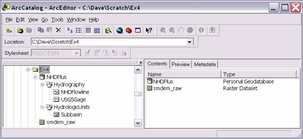 The existing NHDPlus data to be used in this exercise are stored in a geodatabase and loaded in the map. All vector data created with the Arc Hydro tools will be stored in a new geodatabase that has the same name as the stored project or ArcMap document (unless pointed to an existing geodatabase) and in the same directory where the project has been saved (your folder for Ex4). By default, the new raster data are stored in a subdirectory with the same name as the dataset or Data Frame in the ArcMap document (called Layers by default and under the directory where the project is stored). The location of the vector, raster, and time series data can be explicitly specified using the function ApUtilities>Set Target Locations.