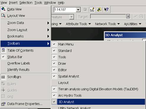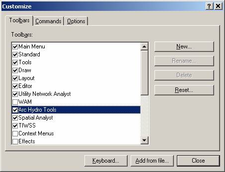 Check the Arc Hydro Tools menu. If the Arc Hydro Tools menu does not appear in the list, click on “Customize” (Scroll down the list to see “Customize”). In the Customize dialog that appears, check the Arc Hydro Tools box.