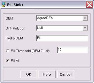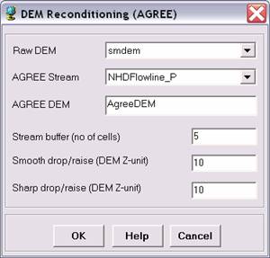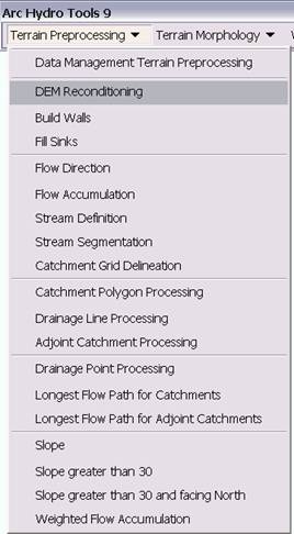 All the steps in the Terrain Preprocessing menu should be performed in sequential order, from top to bottom. All of the preprocessing must be completed before Watershed Processing functions can be used. DEM reconditioning and filling sinks might not be required depending on the quality of the initial DEM. DEM reconditioning involves modifying the elevation data to be more consistent with the input vector stream network (NHDPlus). This implies an assumption that the stream network data are more reliable than the DEM data, so you need to use knowledge of the accuracy and reliability of the data sources when deciding whether to do DEM reconditioning. By doing the DEM reconditioning you can increase the degree of agreement between stream networks delineated from the DEM and the input vector stream networks.
