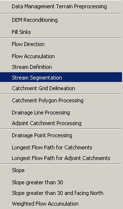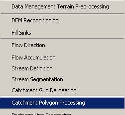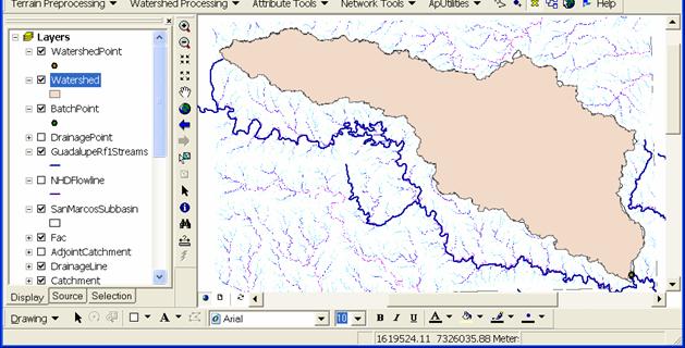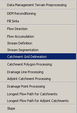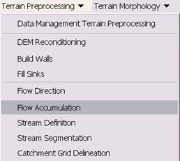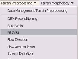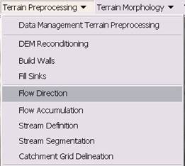 Terrain Preprocessing uses the DEM to identify the surface drainage pattern. Once preprocessed, the DEM and its derivatives can be used for efficient watershed delineation and stream network generation.