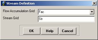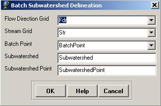 Confirm that the input to the Flow Direction Grid is “Fdr”, and the input to Stream Grid is “Str”. The output Subwatershed is named by default “Subwatershed”, and the output Subwatershed Point is named by default “SubwatershedPoint”.