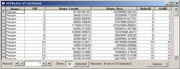 Click No to create index (indices are only really beneficial for large tables). Open the table attribute table for WatershedPointsWithStreamGages which now has watershed attributes joined to it. Note that this single (rather broad) table displays the watershed attributes adjacent to details of each stream gage. The most important attribute is Watershed area, because this is a quantity very important in properly interpreting streamflow. Click Options®Export to export the data into a DBF table.