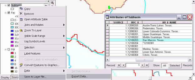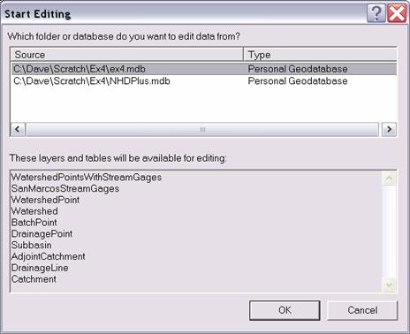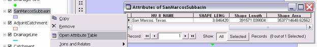 Notice that one watershed point has a very large distance compared to the others. This is the Outlet of the San Marcos feature which does not properly match with any USGS Gage and has been incorrectly associated with the nearest one, 15 km away. We will delete this particular record and only work with the USGS stream gage sites. To do this select View | Toolbars | Editor and then Editor | Start Editing. Select the Ex4.mdb that contains WatershedPointsWithStreamGages to edit.