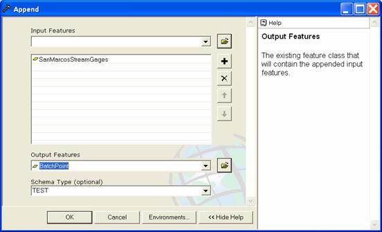Input to the batch subwatershed delineation function is a point feature class with point locations of interest. In this context a watershed, such as was delineated above is the entire area upstream of a point, while a subwatershed is the area that drains directly to a point of interest excluding any area that is part of another subwatershed. Subwatersheds delineated from a set of points are therefore by definition non overlapping because the watershed draining to a point that is within another watershed is excluded from the subwatershed of the downstream point. On the other hand, watersheds may overlap. We will delineate subwatersheds from the same USGS stream gages plus outlet point as used for Watershed delineation.