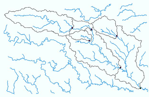 showing the delineated watershed for each USGS Gauging Site. Label each watershed outlet with its