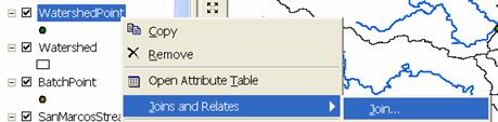 Right click on WatershedPointsWithStreamGages and select Joins and Relates/Join. Select to Join attributes from a table and select "DrainID" as the join field in this layer (WatershedPointsWithStreamGages). Select the "Watershed" table and HydroID field to join. Click OK.