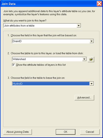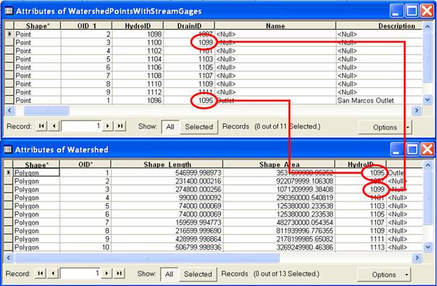 Open the attribute table for the "Watershed" feature class. Notice that it contains a field "HydroID". This is a unique identifier associated with each Watershed. The attribute table of "WatershedPointsWithStreamGages" contains fields "HydroID" and "DrainID". HydroID is again unique (i.e. different from the HydroID of Watersheds and all other objects) because Points are separate objects from Watersheds. The DrainID field gives the relationship between these tables with "DrainID" in WatershedPoints giving the HydroID of the corresponding Watershed. We can therefore join the Watersheds attribute table onto the WatershedPoints table to associate watershed attributes with their outlet points.