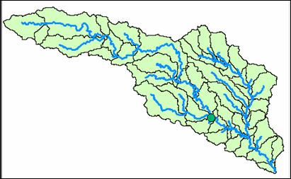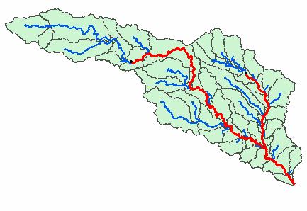 Click your mouse at any point to determine the flow path. The flow path defines the path of flow from the selected point to the outlet of the catchment following the steepest descent. If you select a point along the stream network, the flow path will follow the exact path of the stream.