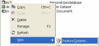 2. Close ArcMap and open ArcCatalog. Right click on the personal geodatabase associated with your map document (ex3, inheriting the name from the map document). If the feature dataset "Layers" is present, delete it. Next create a New Feature Dataset.