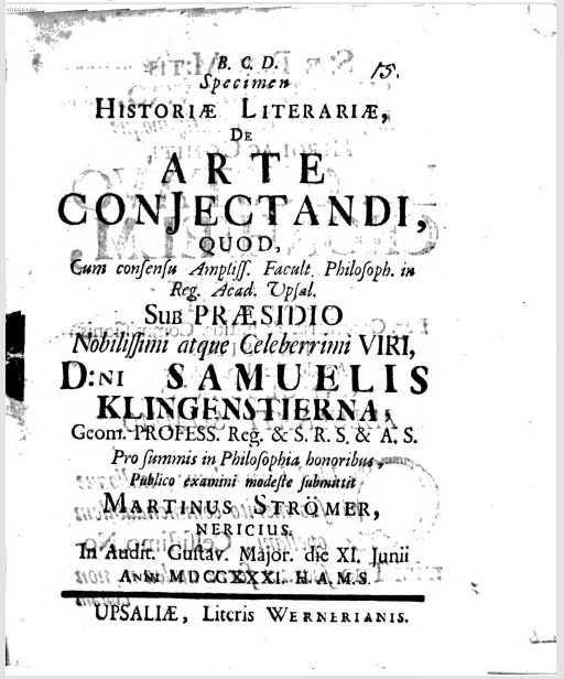 Mårtin (Martino, Martinus) Strömer (1707-1770), Dissertation: Specimen historiæ literariæ de arte conjectandi (1731), Filosofie Magister, University of Uppsala, Sweden. The dissertation cover page is here. An e-doc of the dissertation is here.