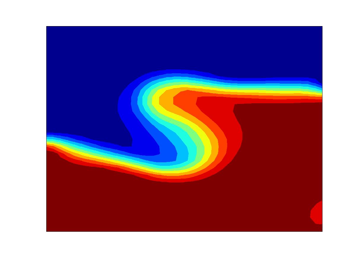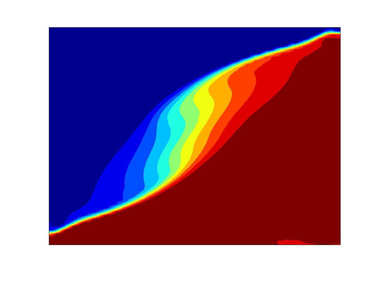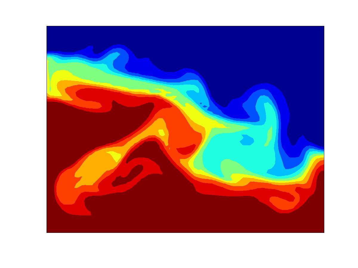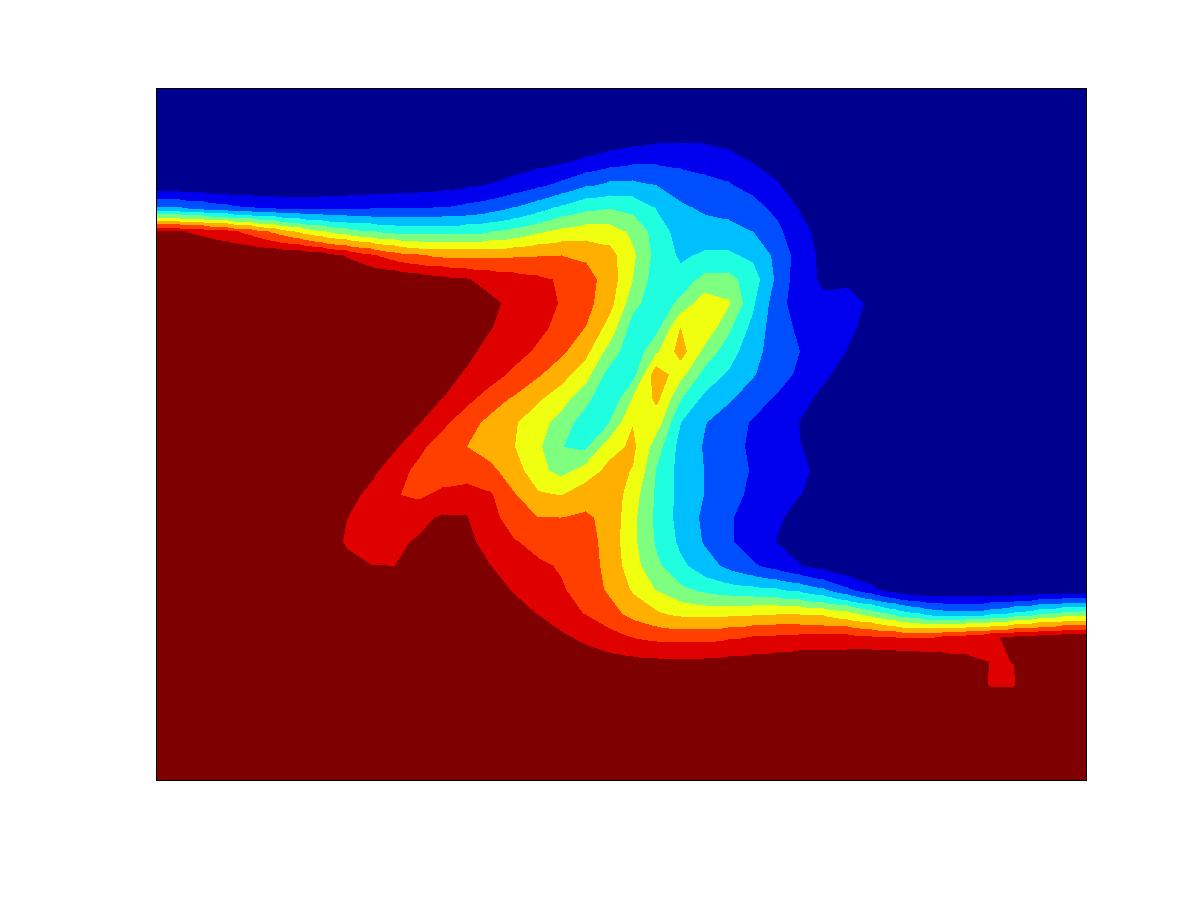Non-hydrostatic model results for breaking internal wave For a similar set of pictures of a hydrostatic wave model <follow this link> For a similar set of pictures of a non-breaking wave <follow this link> For movies (6 at 500 mb each) matching the figures on this page <follow this link> |