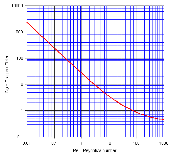 This relationship between the drag coefficient and Reynold's number for smooth spheres is shown below.