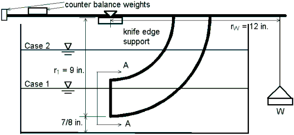 An essential feature of the apparatus is that the center of curvature for each curved surface is at the point of support on the knife edge. Since pressure is a normal stress, the pressures on the curved surfaces do not cause a moment about the support point. The pressures on the two opposite plane sides of the curved object cancel. As a result, only the forces on the plane surface at the end of the curved surfaces and the weight cause moments about the knife edge.