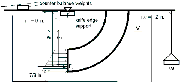 d) Fill the tank with water until the support arm is balanced and horizontal. When the support arm is balanced, the moment of the hydrostatic force on the plane end of the curved object equals the moment of the weight in the weighing pan.