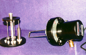 The probe pictured here is used to measure viscosity. With the attachments shown to the left, this probe can be inserted into a flowing liquid while the gauge at the top, shown on the right-hand side of the probe, reads the fluid's viscosity.