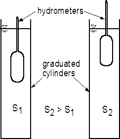 In the experiment, two hydrometers will be placed in graduated cylinders with water containing different concentrations of salt and therefore having different densities. The specific gravity of the fluid is read where the liquid surface intersects the stem of the hydrometer.