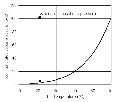 Vapor pressure (pv) is the partial pressure of liquid vapor, for example, water vapor in the atmosphere. Saturated vapor pressure (pvs) is vapor pressure that is in equilibrium with an open liquid surface at a given temperature and total pressure. Values of saturated vapor pressure for water are given in Table 1.1 and Fig. 1.4. This equilibrium is a dynamic one with the liquid vaporizing and condensing at the same rate at an exposed surface. Relative humidity is the ratio of the existing vapor pressure to saturated vapor pressure.