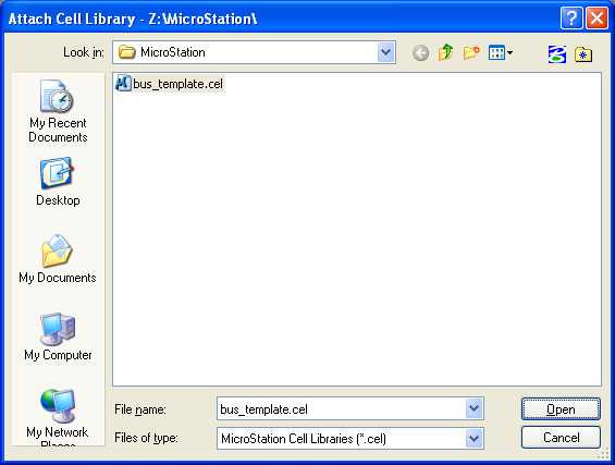 D.3. In the Attach Cell Library dialog box under Look in:, choose My Computer then Home Directory (Z:) then MicroStation; under Files of type, choose MicroStation Cell Libraries (*.cel); choose bus_template.cel; and press the Open push button.