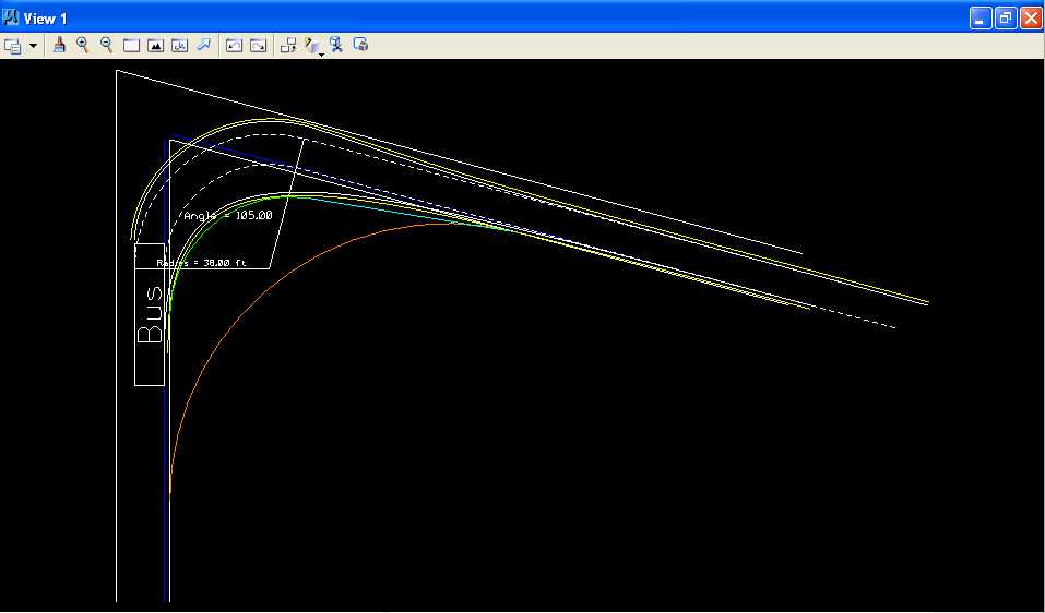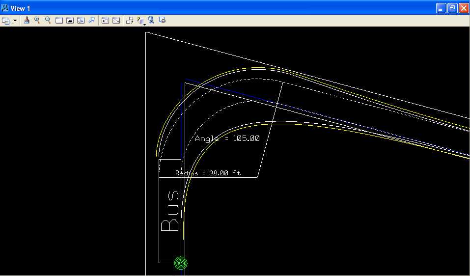 D.4. In the Cell Library: [Z:\MicroStation\bus_template.cel] dialog box under Name, choose BUS and under Active Cells select Placement. IGIDS was used to generate this vehicle turn template for a Bus with a turn radius of 38 feet, with a 1 foot clearance zone (yellow lines), and with a turn angle of 105 degrees.
