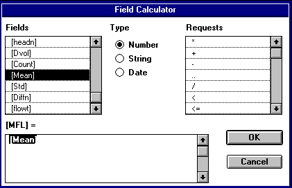You also need to specify the mean flow length field -- "MFL" -- in this table because numbers in this field are used to estimate losses during overland flow. Highlight the field "MFL" and use the calculator as shown below.