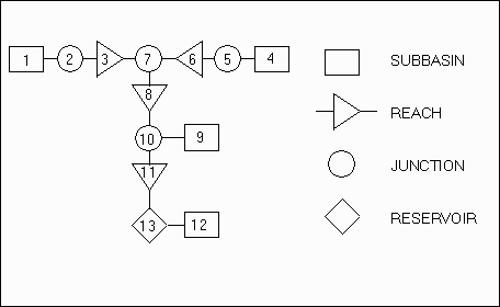 Once the hydrologic elements have been defined and their connectivity is established the watershed data is said to be described with a hydrologic data structure. This data structure can be presented in a stick diagram form as shown in Figure 1.2 or in the form of an ASCII input file for a hydrologic model.