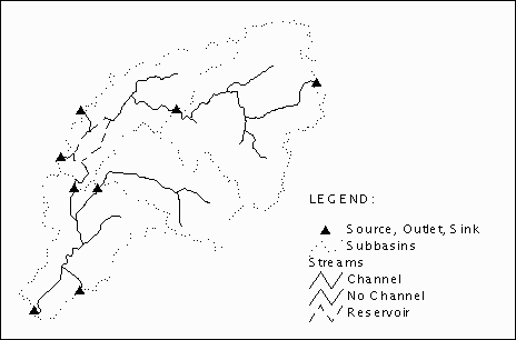 The stream layer is intersected with the subbasin layer to produce a new layer containing only those streams within the watershed as shown in Figure 2.2. This process removes streams outside the watershed and identifies the intersection of streams and subbasin boundaries. The intersections represent the locations of sources, subbasin outlets or sinks. The intersections are marked with solid triangles in Figure 2.2.