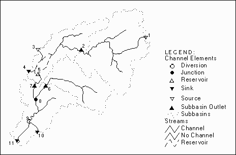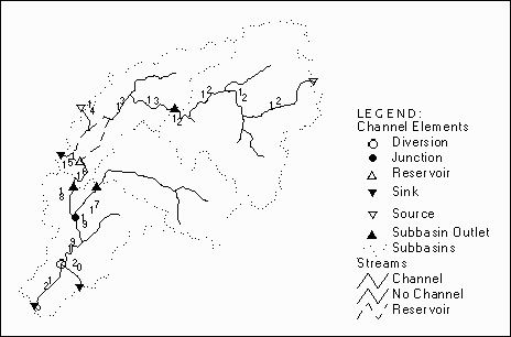 With all the channel elements established and connectivity identified, a symbolic layer is generated showing the schematic model of the flow network, as shown in Figure 2.7. The lines in the layer represent connections among hydrologic elements. A connection can be via a reach (heavy lines) or a link (light lines) from a subbasin to its outlet. The nodes in the coverage represent connections between channel elements. Channel elements can be diversions (hollow circles), junctions (solid circles), reservoirs (hollow triangles), sinks (upside-down solid triangles), sources (upside-down hollow triangles), and subbasins (rectangles). Note that elements previously classified as subbasin outlets are now combined with junctions, because in the hydrologic data structure they both serve as flow summing points.