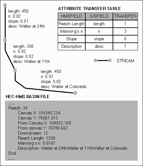Field Name Description hecid ID hectype hydrologic element type hecupid ID of upstream element hecdnid ID of downstream element hecupx x coordinate of upstream element hecupy y coordinate of upstream element hecdnx x coordinate of downstream element hecdny y coordinate of downstream element input all items specified in the reach attribute transfer table
