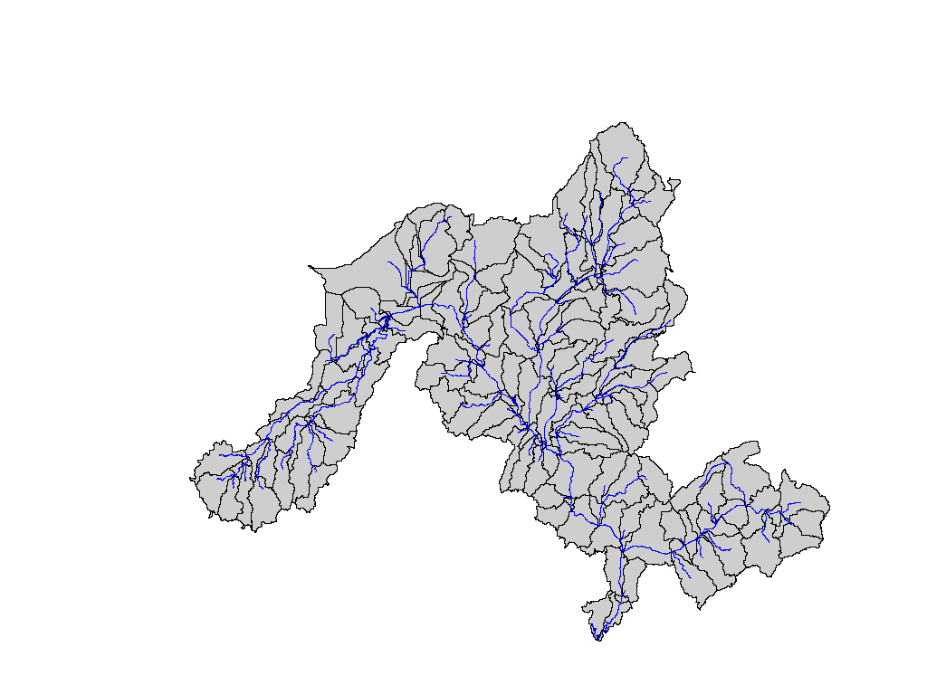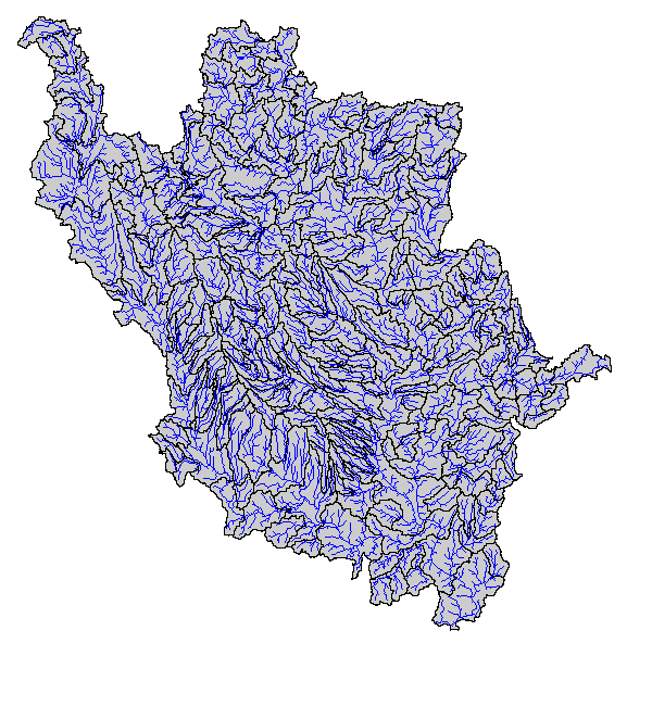 The stream and subbasin layers are shown in blue and black