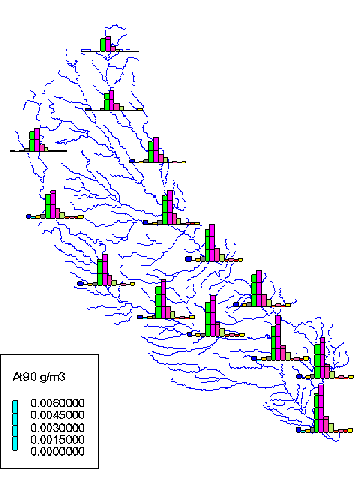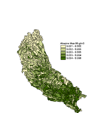 The results of the calculations can be presented on the map of modeling units. Figure 5.11 shows an example of atrazine concentrations in streams for May 1990.