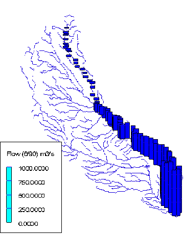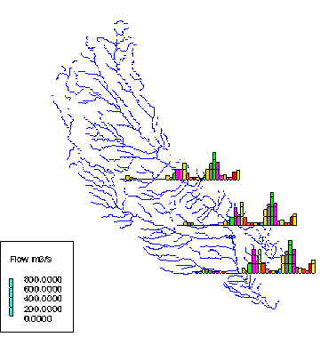 The bar charts that represent the monthly flow rate and the average precipitation depth for a selected time period can be drawn at the center of selected modeling units ( draws charts of the flow rate and draws charts of the precipitation depth). The script associated with the button displays all recorded flow rate (monthly values from January 1960 to December 1992) for a specified modeling unit. Since charts of monthly flow rate for multiple year periods can be drawn, the wet or dry years can be easily identified. Figure 5.12 presents the monthly flow for years from 1989 to 1991.