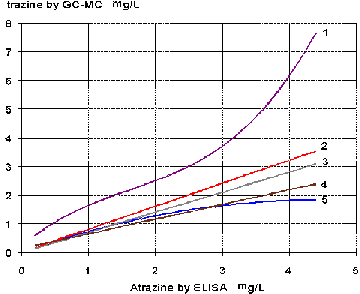 The estimation of the CG/MS atrazine concentrations from the ELISA tests is commonly used in practice. Figure 5.1 compares the estimated in this research relationship with the functions developed by different authors.
