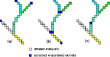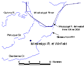 Before further calculations are made, the stream network delineated from the DEM is compared with the RF1 map to visually verify the flow system. One major inaccuracy was found: the Wisconsin River, the Mississippi River tributary, has flowed to the Great Lakes. To correct this error the elevation of some cells of the DEM were changed to force the flow in proper direction. Correction of the flow system can also be made by making changes directly to the flow direction grid. The process shown in Listing 5.1 was repeated until satisfactory map of the flow system has been constructed.