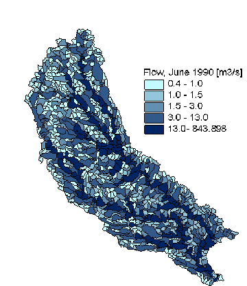 The program fd4y is executed in line 6. Since UNIX is a multitasking system, the AML must wait until fd4y finishes calculations. Lines 7 to 10 contain the loop in which AML checks if fd4y program created output file xxxunout. In lines 11 to 14, the temporary INFO file m199003.dat is created in which the results of the fd4y calculations are stored (line 15). Then, the estimated flow rate is attached to the Arc/Info database file unflow.pat (line 17) and the temporary file m199003.dat is deleted (line 18). In the complete version of this procedure (fd4y.aml), the process described here is repeated for all months from the specified time period. Figure 5.7 presents an example of estimated runoff that occurred in June 1990.