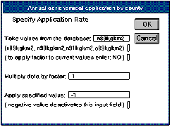 Edit Application. This button displays dialog boxes that allow the user to specify the agrichemical application rate. If the view-window "Application Rate" is active, the application in either all, or selected counties can be specified. Additionally, the application rate of nitrogen fertilizers estimated for 1989, 1990, and 1991, and application rate of atrazine estimated for 1989 can be selected. If the view-window "Modeling units" is active, the application rate in each modeling unit can be modified.