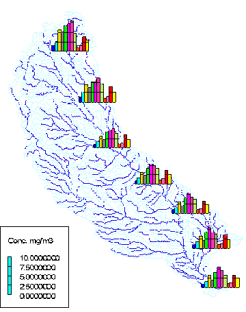 This project reserves the space for preparing the maps of estimated agrichemical concentration and load in surface water. Three scripts, executed from the button bar,, draw the bar charts of the monthly average chemical concentration, chemical load and flow rate, respectively. Figure 5.10 presents the agrichemical model results of the estimation atrazine concentrations in 1990 in the form of bar charts located along the Iowa River and the Cedar River.