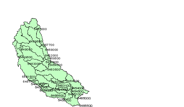 Figure 4.13 The Iowa-Cedar River basin: subwatersheds and selected USGS gauging stations (numbers represent station ID).