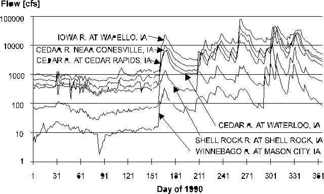 Figure 4.17 Example of time series recorded in gauging stations located along the Cedar River. The data are for the water year 1990. The logarithmic scale is used to show all time series in one picture.