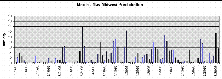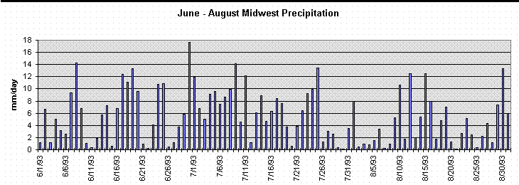 We expect to see strong atmospheric moisture flux on days with heavy rainfall. Here is the precipitation for the period March - August, 1993, for which the atmospheric moisture flow data are available.