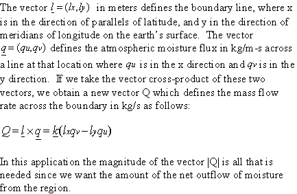 Hence, Q = (59118 x (-53.60) - 17787 x 114.96) = -5,213,518 kg/s. The total amount of moisture which flows over this boundary line in each 12 hour period is given by Q x 43,200, where 43,200 = 12 x 60 x 60, the number of seconds in 12 hours. Hence, the mass of moisture passing over this line in 12 hours on 1 March 1993 was -5,213,518 x 43,200 = -225,223,991,424 kg/12 hr. To make the numbers more readable, they are expressed in units of 10^12 kg/12 hr, so the flow presented in the compflux.dbf table is -0.2252 x 10^12 kg/12 hr. Again, the negative sign arises on this flux because it is an inflow to the region.