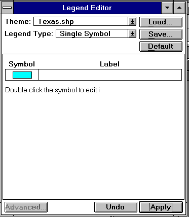 The Legends for these Themes can be modified as described below. Once you've got your Project set up, you can save it to a file by making the Project window active and choosing the menu option File / Save Project. The Project file that you save has the extension ".apr" and contains information about the structure of your project, including the pathnames to the data dislayed in it. The Project file is an ASCII file that can be viewed with a text editor if you are curious about what it looks like. It is wise to periodically save the Project as you carry out this exercise so that you can recover all your work in the event that you crash Arcview before completing the exercise.