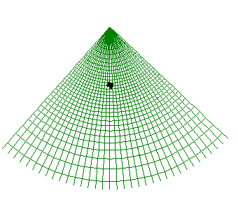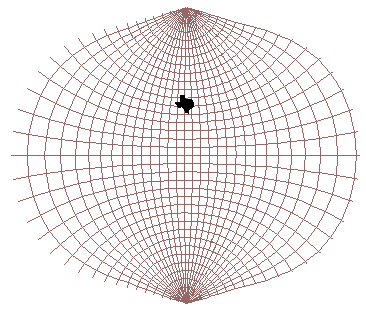 Texas is a dark dot in the center of the meridians. Use the Zoom tool to highlight the State. Notice that Texas appears to be tilted to the right slightly. This occurs because the Central Meridian of the projection use is 96W, which would appear as a vertical line in the display. Regions to the West of this meridian (most of Texas) appear tilted to the right while those to the East of this meridian appear tilted to the left.