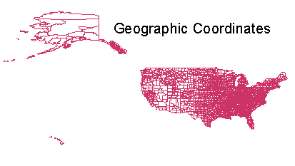 If you display the county map in Arcview before and after making the projection from geographic to US Albers coordinates, you'll see the map changes like this: