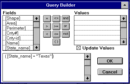 To select the counties which make up Texas, a special display of the counties theme can be set up as follows: