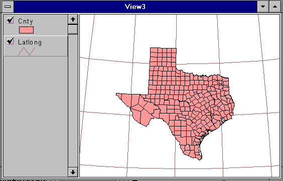 The data can also be downloaded via via anonymous ftp from ftp.crwr.utexas.edu/pub/gisclass/ex3. You will need Arcview shape files for the data layers named cnty, deg30, latlong, states, and world94. Each of these shape files has several component files whose extensions are .dbf, .shp, .shx, etc. You will need ALL of these files in order to view the shape file in ArcView. If you are using ftp from the command line, you can use the command mget filename.* to get all files whose stem name is filename. Ftp will prompt you for each file and ask if you want to transfer the file. Use the Binary option of ftp for these file transfers. If necessary, see Instructions on how to use anonymous ftp.